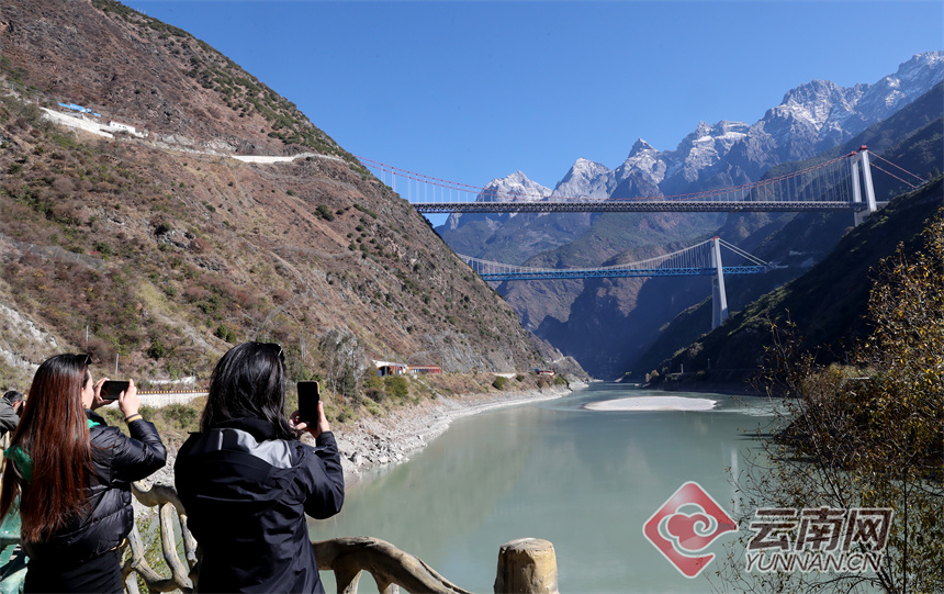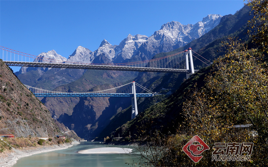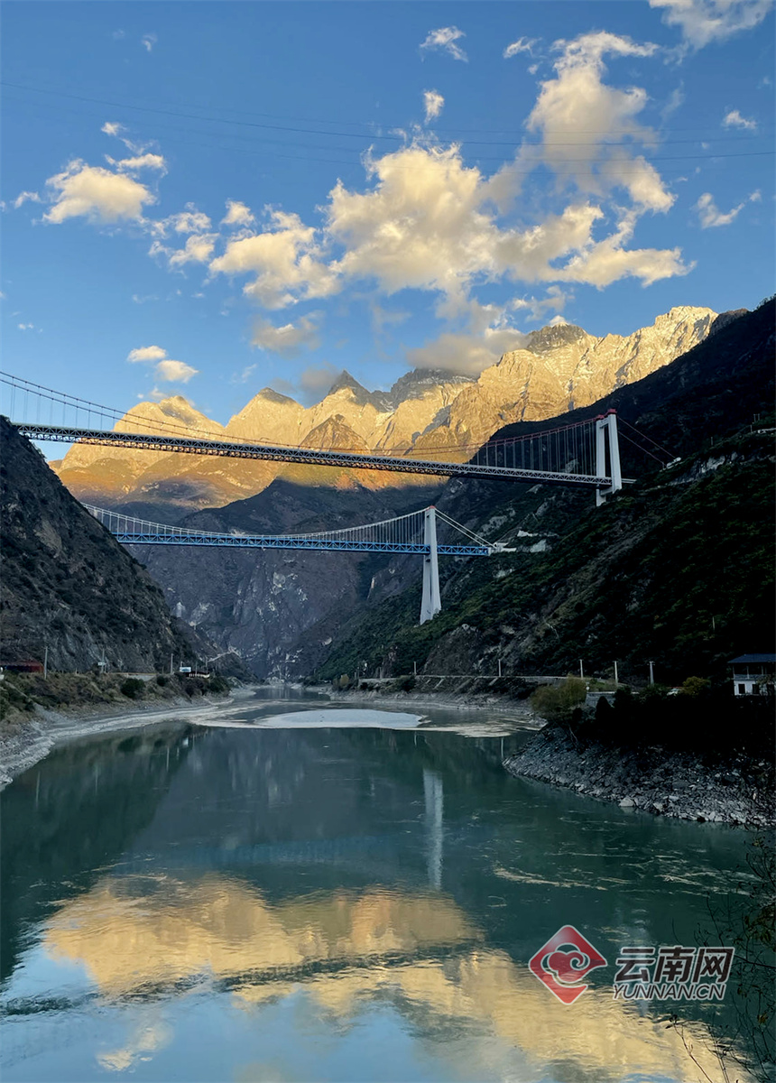 On December 10th, during the sunset hour, the Li Xiang Railway and the Li Xiang High-Speed Jinsha River Bridge, also known as the "Canyon Double Rainbow," soared majestically across the grand canyon beneath Jade Dragon Snow Mountain in the Tiger Leaping Gorge section of the Jinsha River in Diqing, presenting a breathtaking vista.